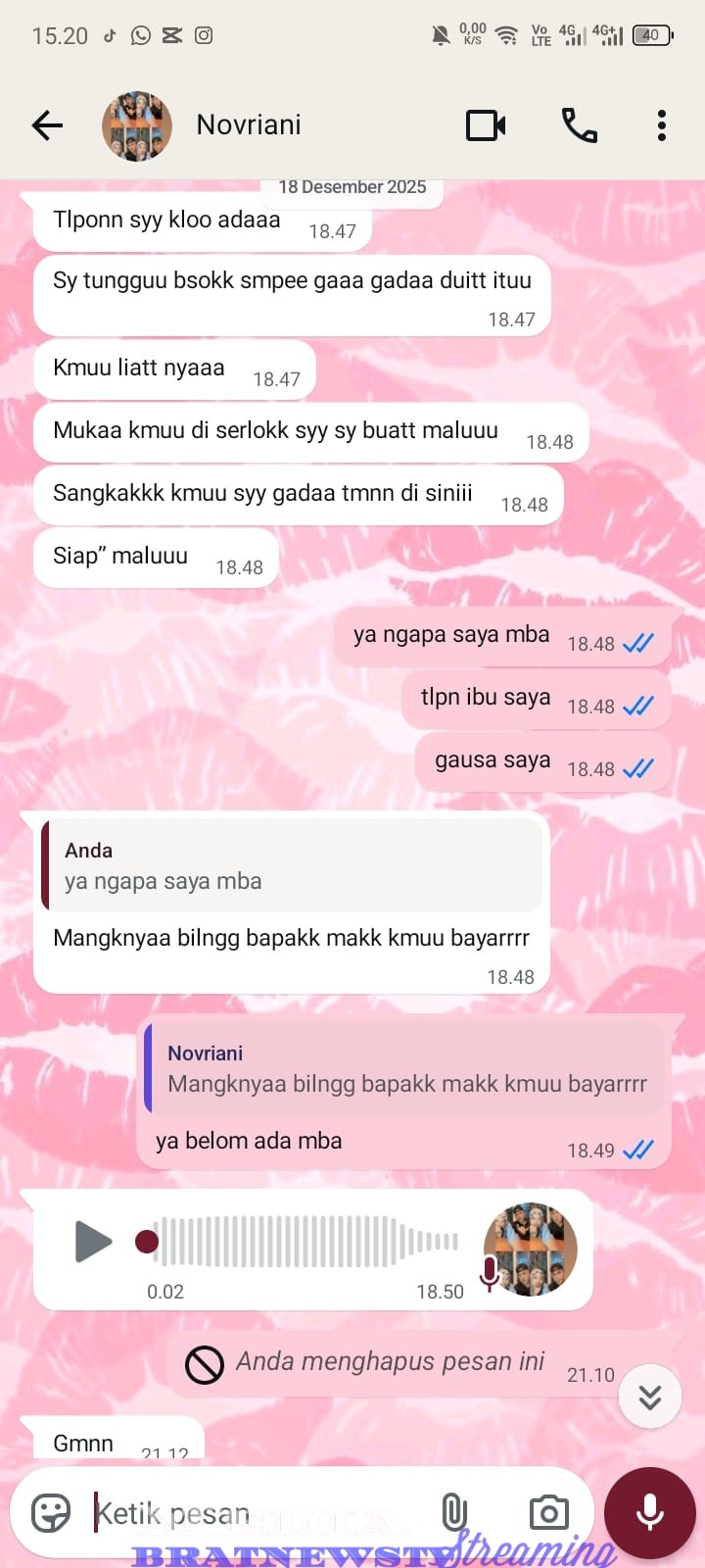 “Rupanya handphone anak saya di pegang sama NV itu, lalu saya tanya kenapa kamu ambil handphone anak saya, dia NV makin nyolot pak, ini ada rekaman audio, yang dia kirim sama saya pak,” kata Subiarti.
