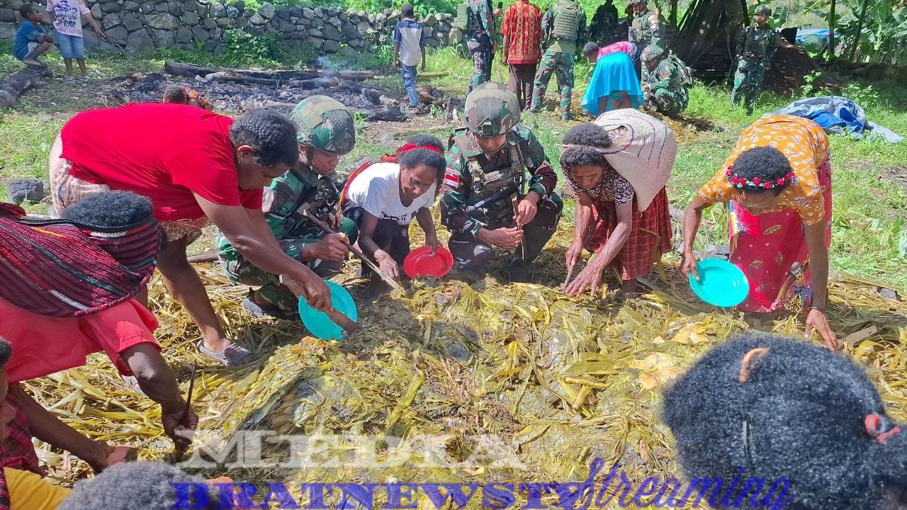 BrataNewsTV – Papua, –Tradisi “Bakar Batu” adalah upacara adat yang sakral dan penting di Papua, Kegiatan ini melibatkan seluruh masyarakat dan dihadiri juga oleh anggota TNI Satgas Yonif 521/DY Pos Kurima, Distrik Kurima Kab. Yahukimo, Papua Pegunungan yang bertugas di wilayah tersebut sebagai bagian dari interaksi sosial dan penghormatan budaya.