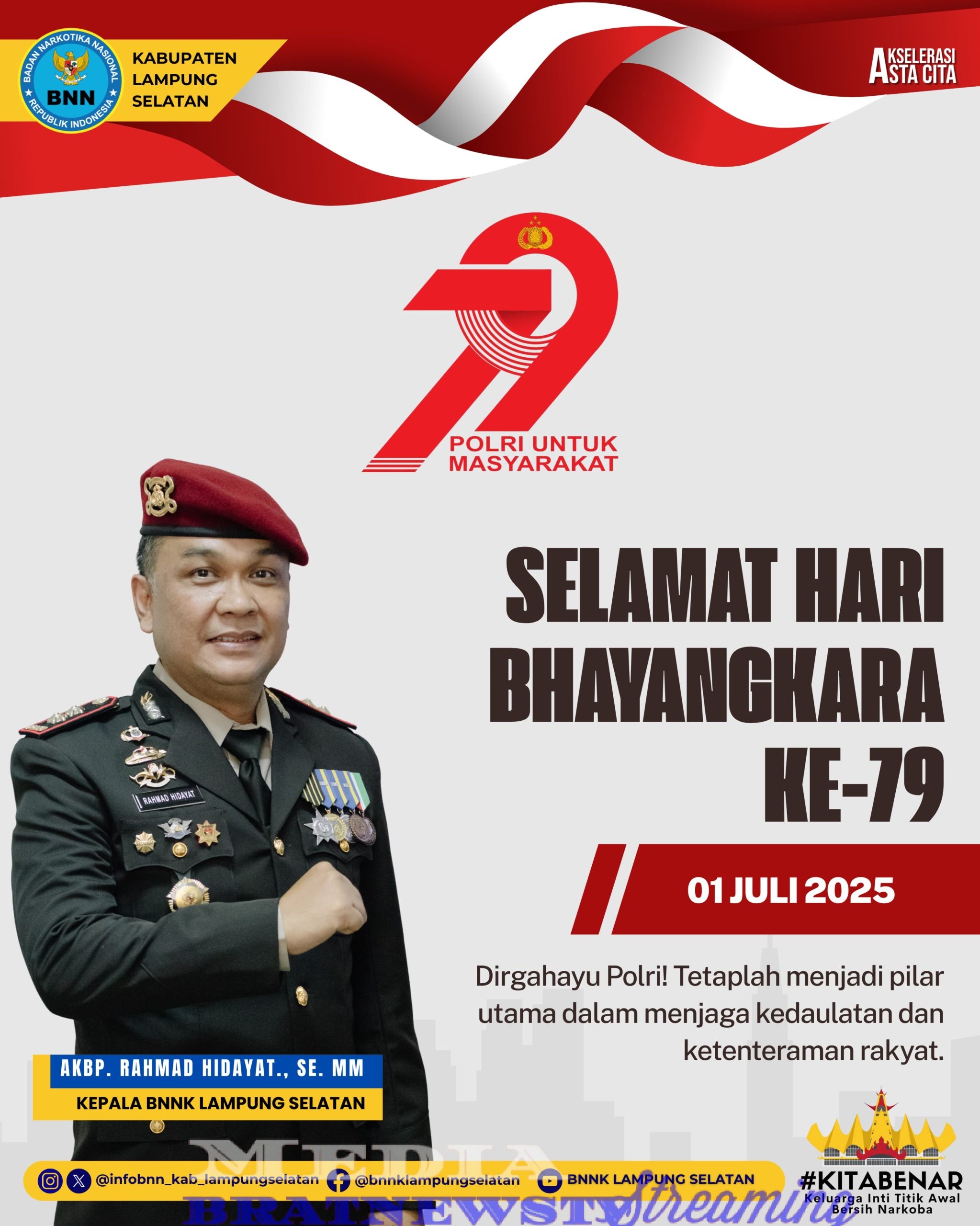Lampung Selatan – Kepala Badan Narkotika Nasional Kabupaten (BNNK) Lampung Selatan, AKBP Rahmad Hidayat, S.E., M.M., mengucapkan selamat Hari Ulang Tahun (HUT) Bhayangkara ke-79 kepada seluruh anggota Polri. Dalam kesempatan ini, AKBP Rahmad Hidayat menyampaikan apresiasi atas peran vital Polri dalam menjaga stabilitas dan keamanan negara.